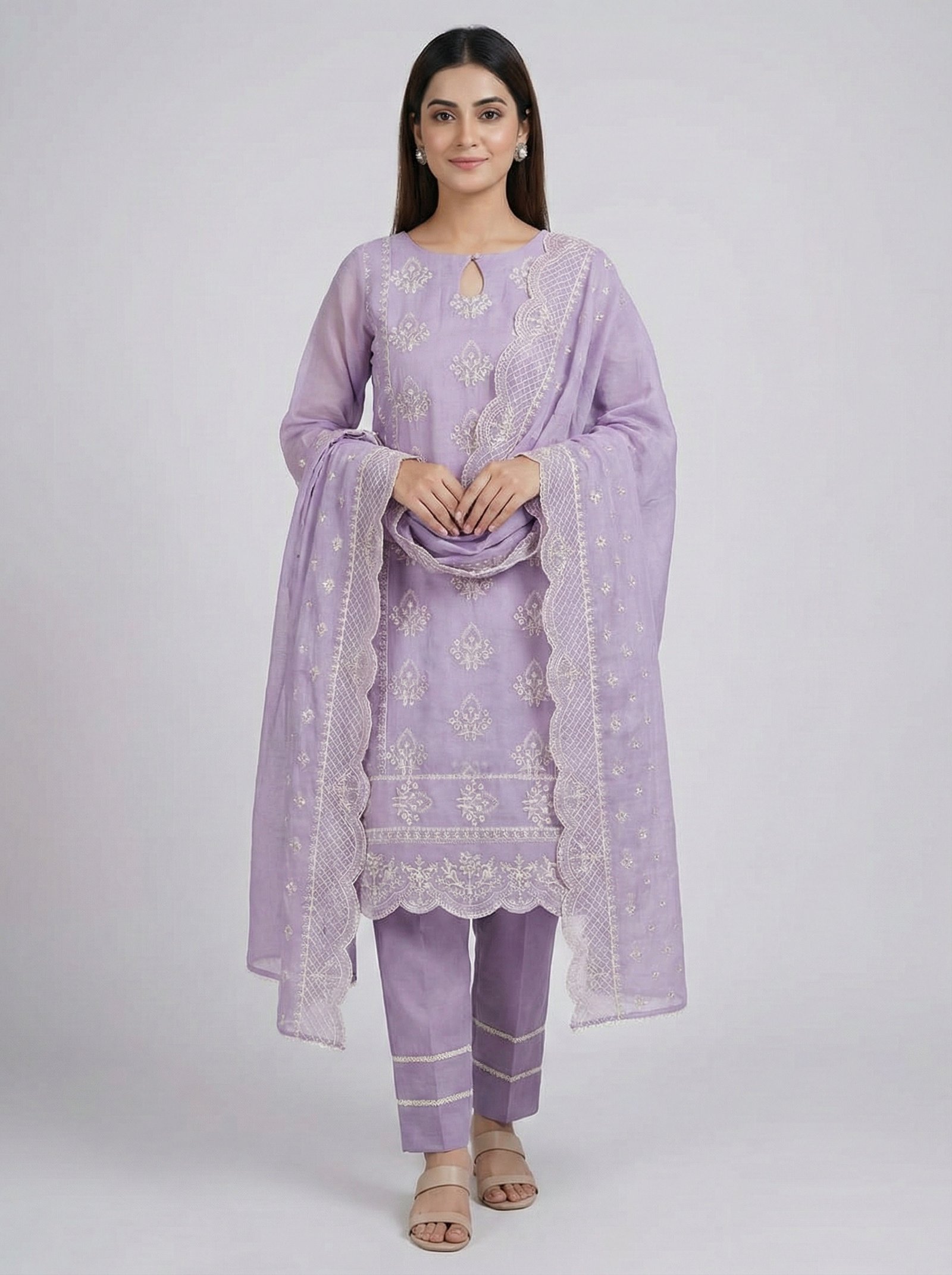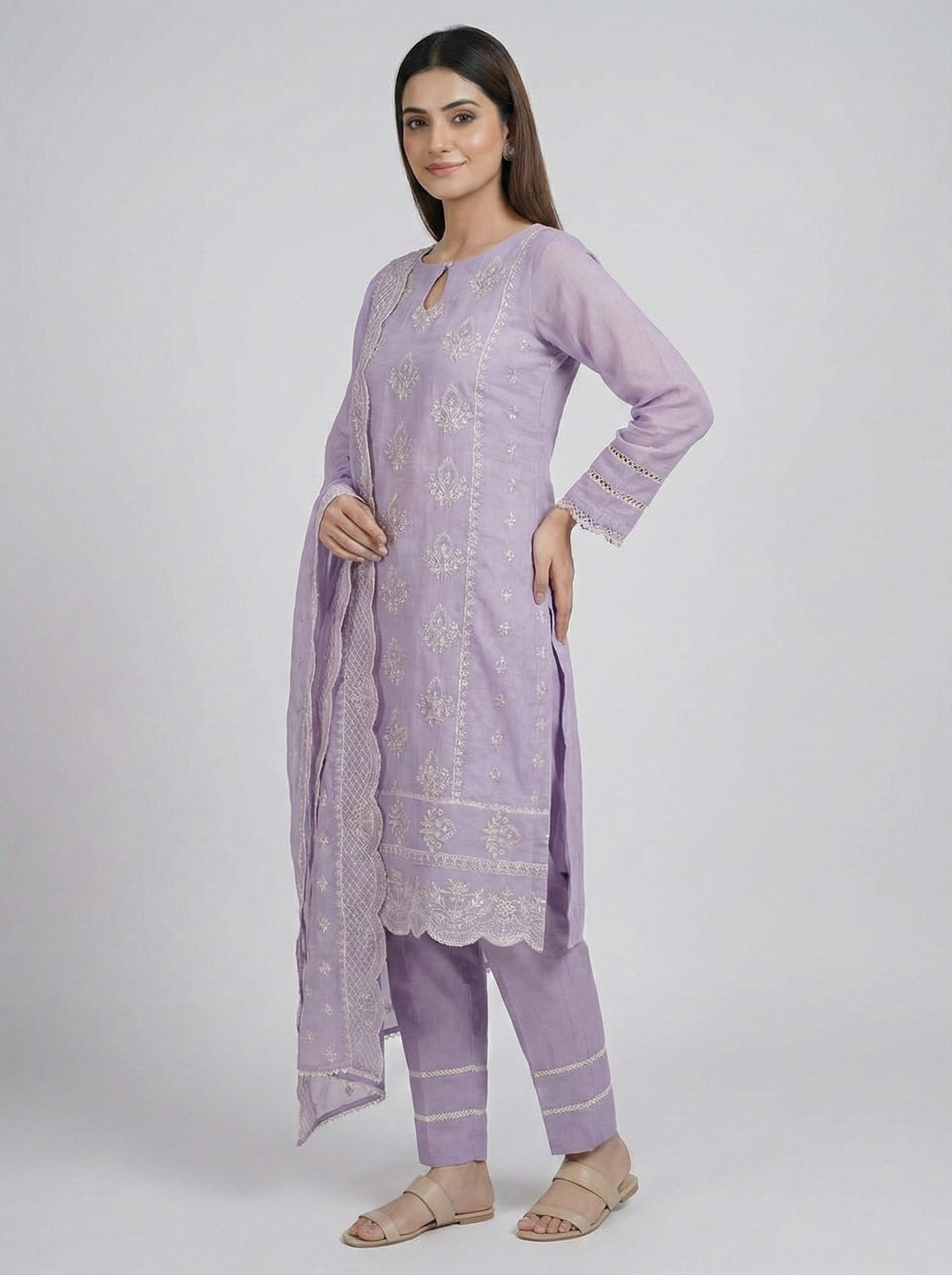 PAH-013 — Embroidery (3 PCs, Unstitch, Lilac): Lilac Cora cotton three-piece unstitched outfit with matching Cora cotton dupatta and Khaddi cotton trouser — soft and sophisticated. Shirt 3 mtrs, Dupatta 3 mtrs and Trouser 2.5 mtrs