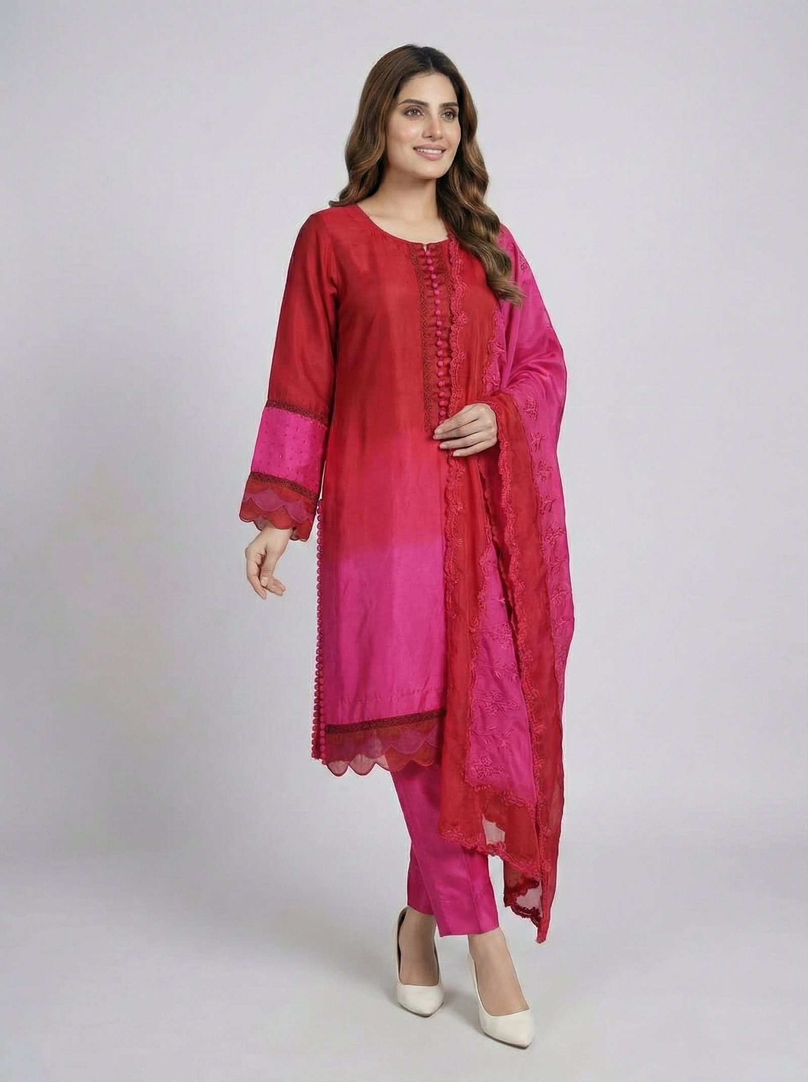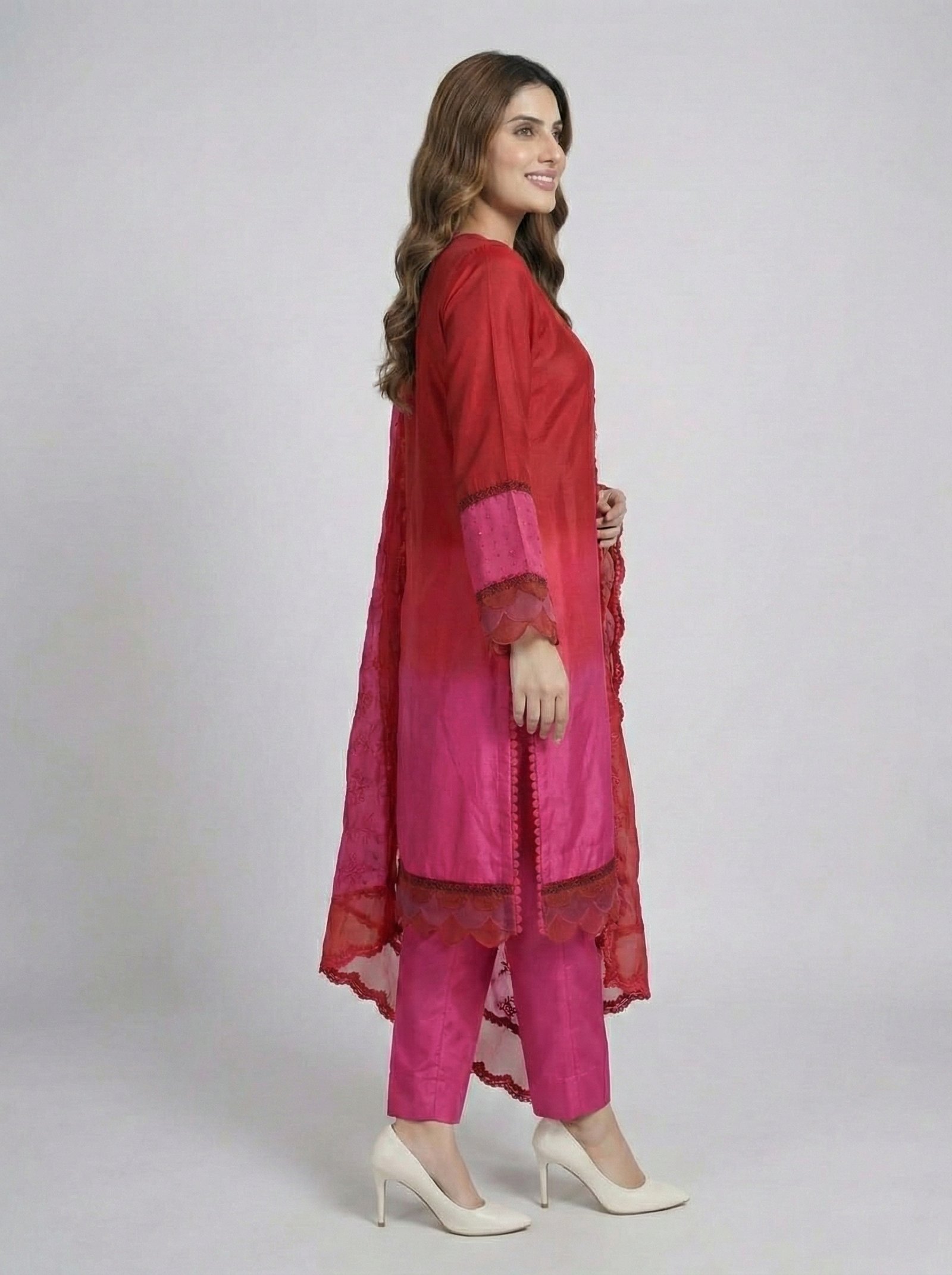 PAH-028 — Formal — Shisha Silk (3 PCs, Unstitch, Omara Red+Pink): A formal three-piece unstitched set in shisha silk with Cora dupatta and shisha silk trouser — richly decorative and occasion-ready. Shirt 3 mtrs, Dupatta 3 mtrs and Trouser 2.5 mtrs (only make to Order)
