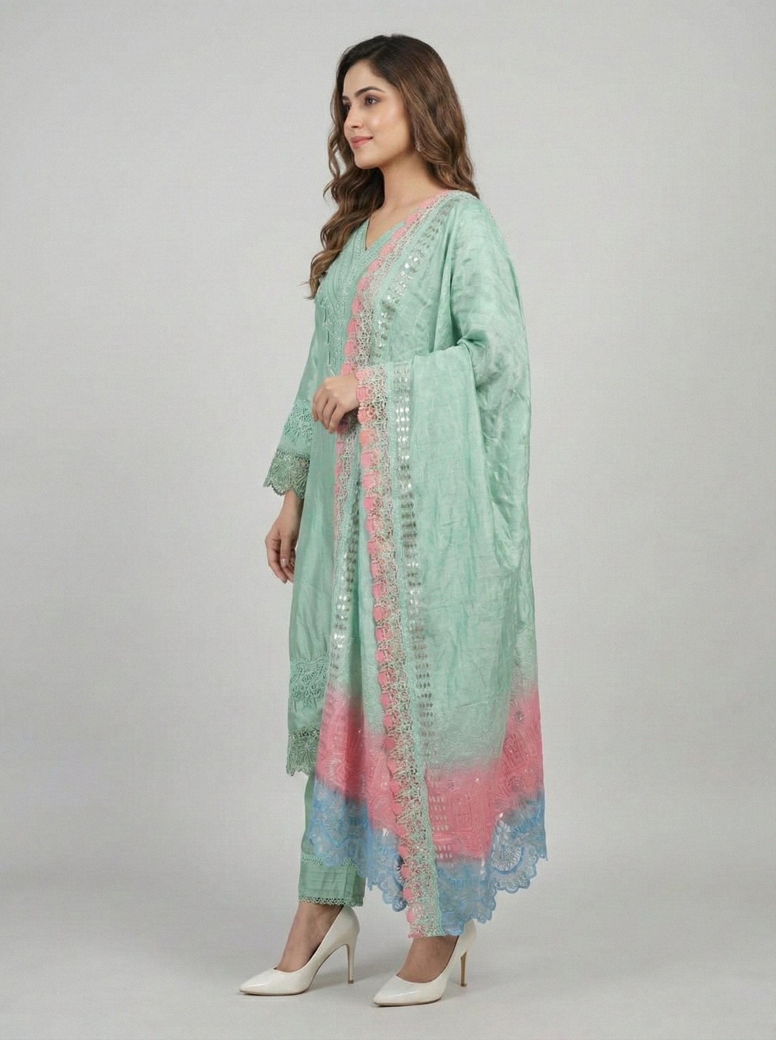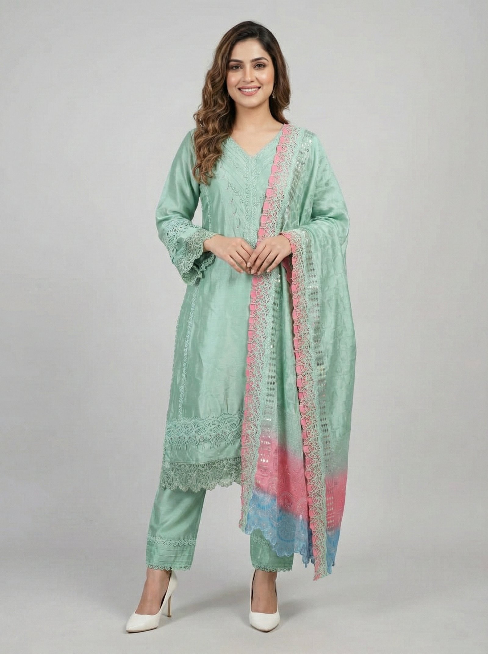 PAH-031 — Formal — Shisha Silk (3 PCs, Unstitch, Aqua Green): Aqua green shisha silk three-piece unstitched suit with pure resham chiffon dupatta and shisha silk trouser — contemporary elegance for special events. Shirt 3 mtrs, Dupatta 3 mtrs and Trouser 2.5 mtrs (only make to Order)