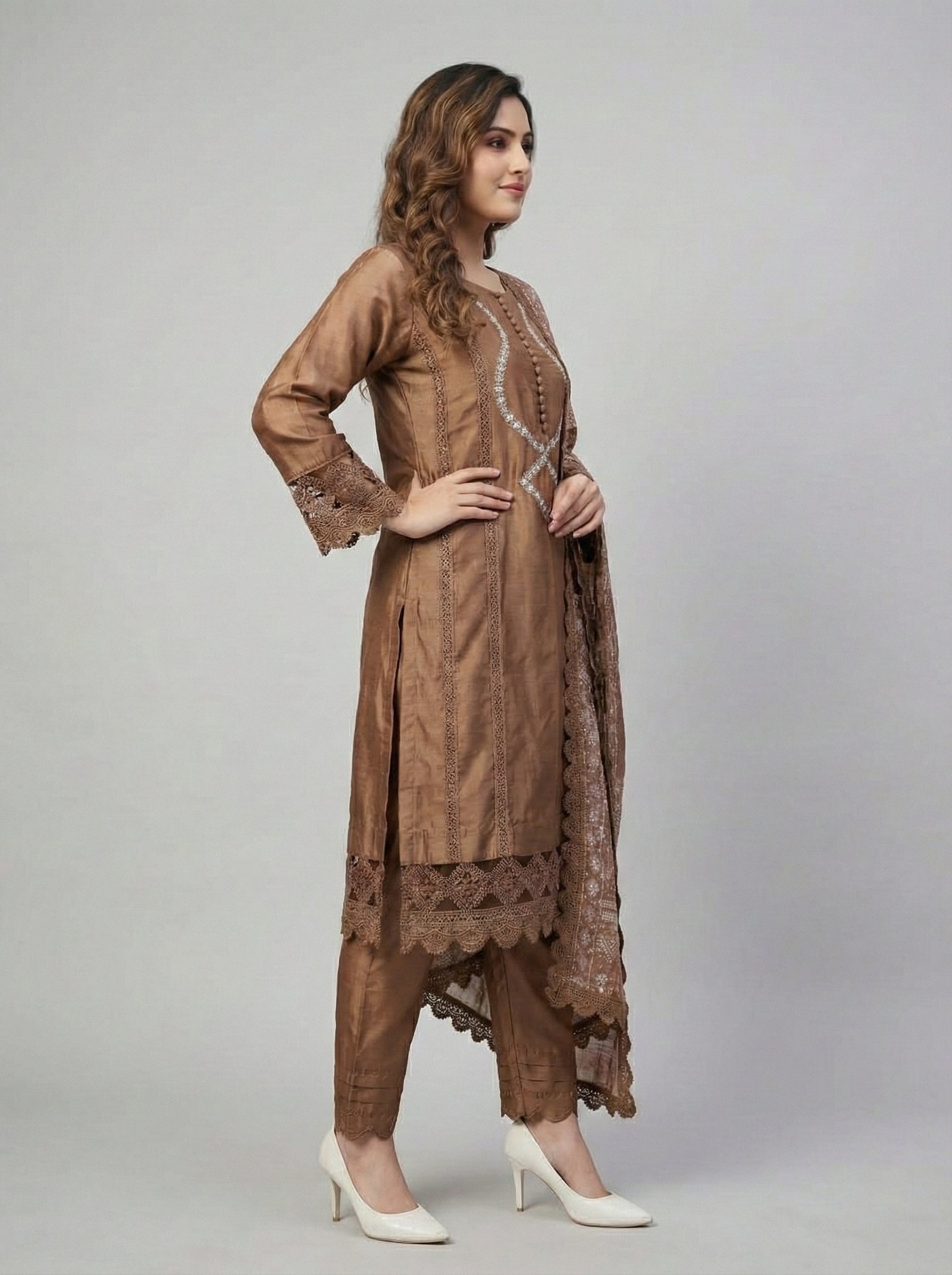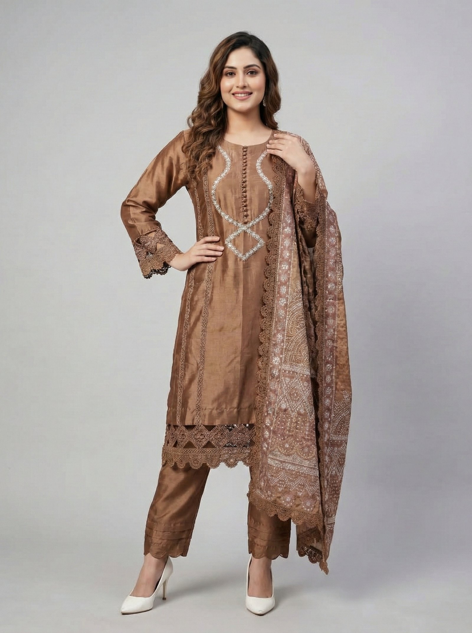 PAH-032 — Formal — Shisha Silk (3 PCs, Unstitch, Brown Green): Brown shisha silk three-piece unstitched suit with pure resham chiffon dupatta and shisha silk trouser — contemporary elegance for special events. Shirt 3 mtrs, Dupatta 3 mtrs and Trouser 2.5 mtrs (only make to Order)